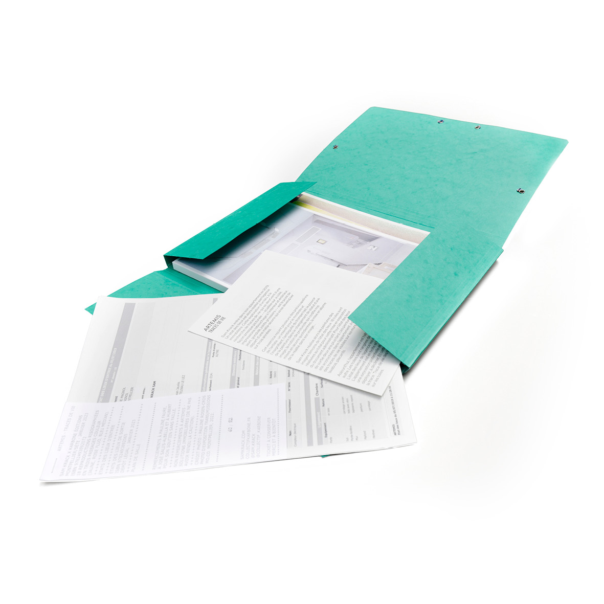 Le coffret ARTEMIS-Traces de vie rassemble 18 reproductions des toiles de Sam Krack imprimées en risographie trois passages, un exemplaire de l’état des lieux d’entrée, un livre présentant les toiles exposées dans l’appartement lors de l’état des lieux de sortie face à des images de synthèse d’agence immobilière, un index des peintures et un texte de Pauline Faure.