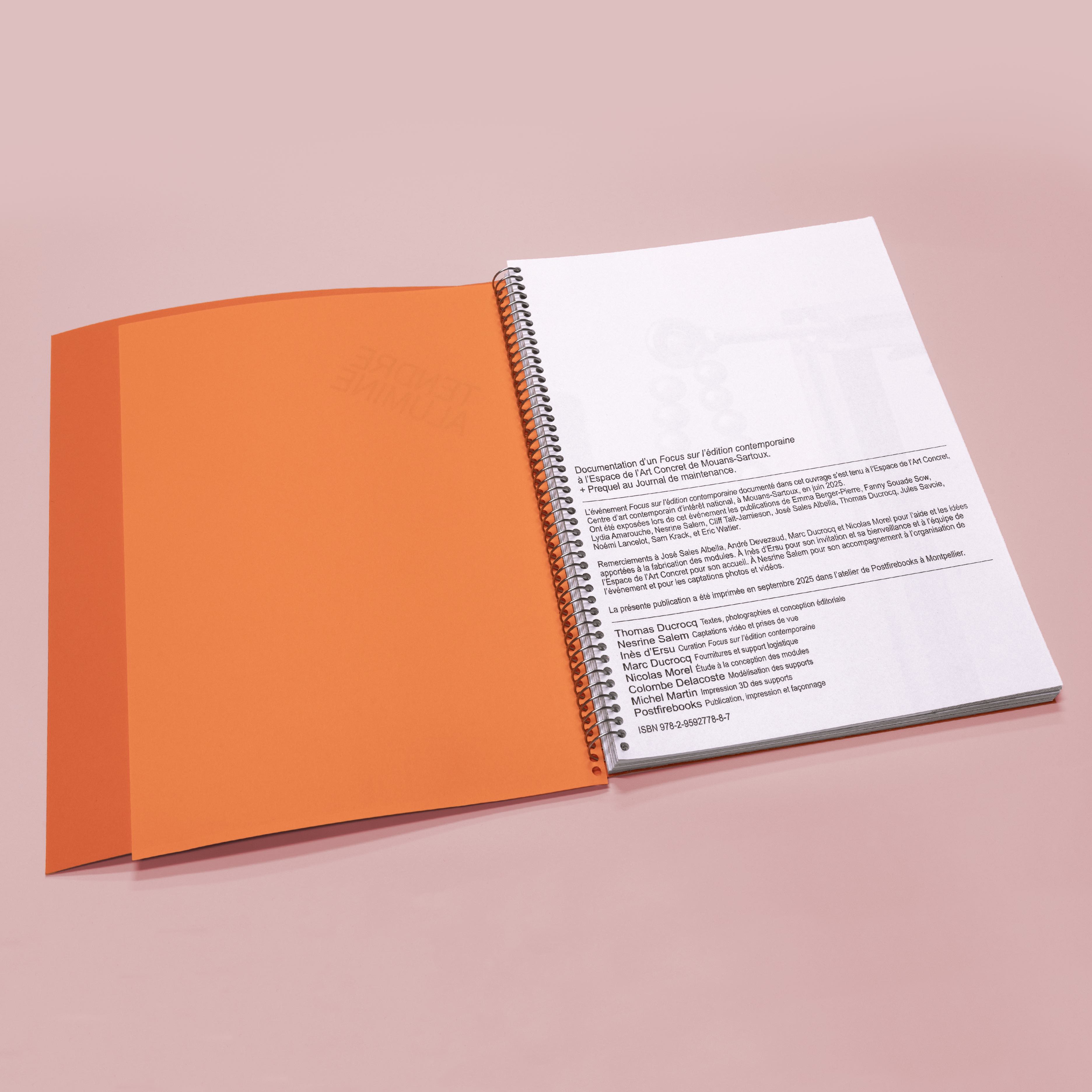 Tendre Alumine documente l’exposition de Postfirebooks Focus sur l’édition contemporaine s’étant déroulé en juin 2025 à l’Espace de l’Art Concret de Mouans-Sartoux. Cet événement est un prétexte pour approfondir des recherches autour de la publication et de sa présence dans les espaces d’exposition - des recherches entreprises au travers du projet éditorial Postfirebooks.